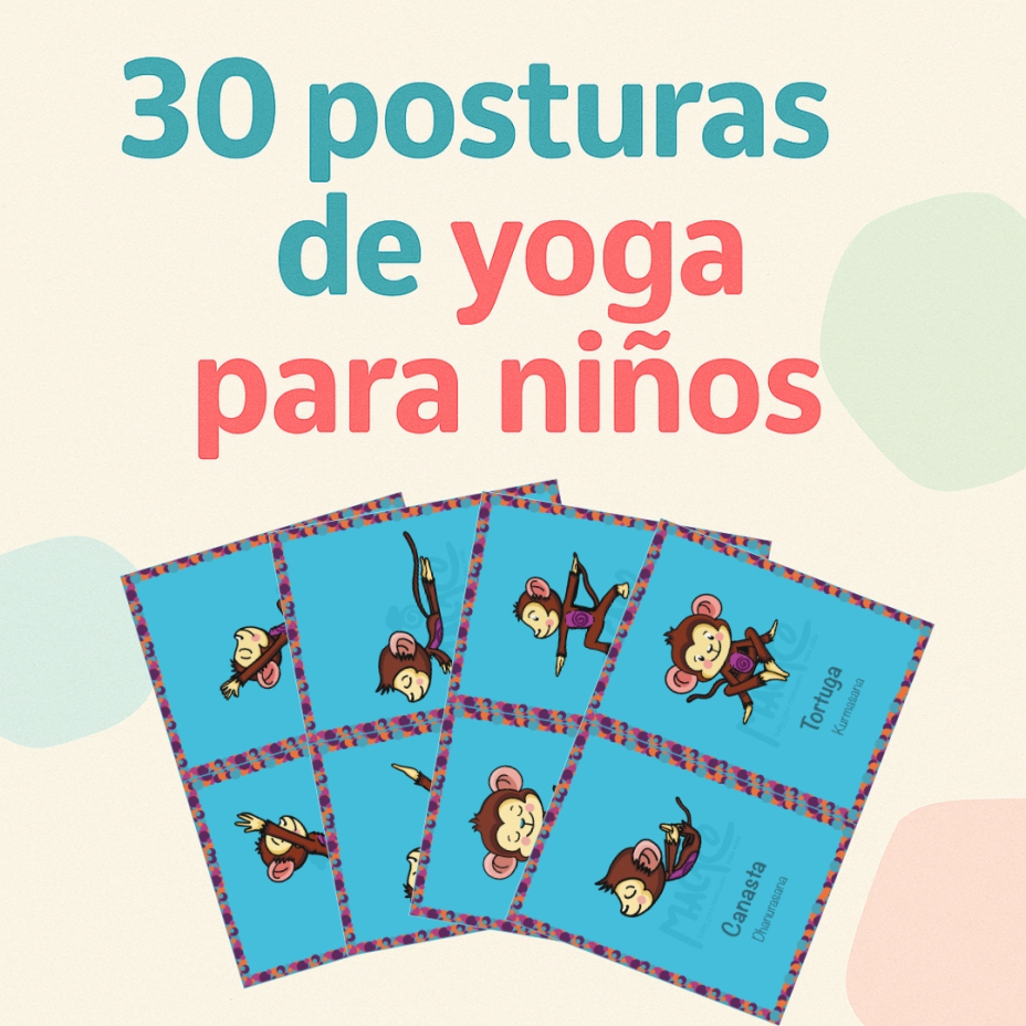 Este set incluye 30 cartillas con posturas de yoga especialmente diseñadas para niños y niñas. Cada imagen está ilustrada con el tierno personaje de Macaco Yoga.