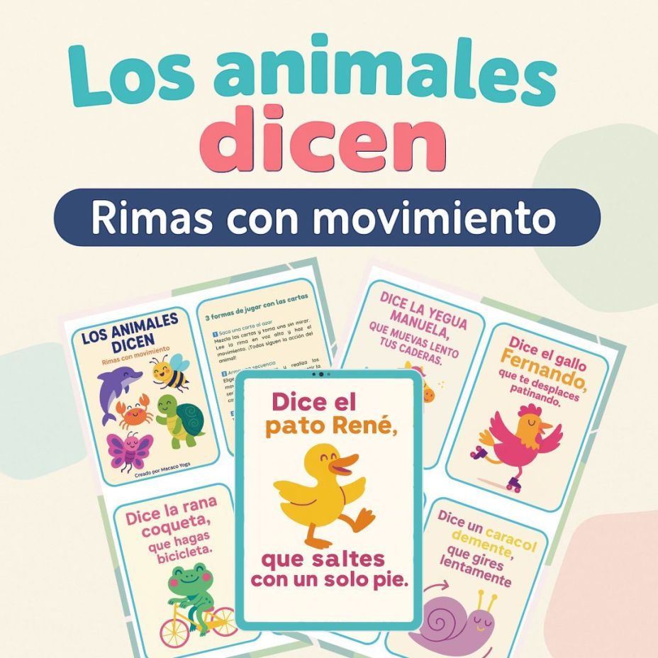 "Los animales dicen – Rimas con movimiento" es un recurso lúdico y educativo que incluye 30 cartillas ilustradas con rimas que invitan a los niños a imitar animales a través del movimiento.